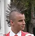 Also known as the 'fashion punk cut', the hairstyle is an approximation of a mohawk made without shaving or 'buzzing' the hair on the sides of the head, thus allowing an imitation of the look of a real mohawk not having to commit to removing most of one's hair. The name is a portmanteau of faux, the French word for false or fake, and 'mohawk'. |