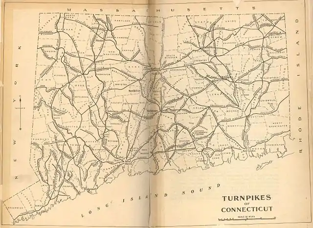 | Connecticut Turnpike | May 1806 | Fairfield - Southport - Westport - Norwalk - Darien - Stamford - Greenwich - New York (Westchester Turnpike) | U.S. Route 1 | Included the Greenwich Road (1792) |