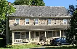 A fieldstone farmhouse was built in 1850[27] at the corner of Blue Church Road South and Beverly Hills Rd (catty-corner from the schoolhouse). This home design shows the German design influence (only four-across exterior bays with two rooms on the first floor) on the Federal style (symmetrical design; arch window above door).[28] Originally, this house had a stucco exterior. The third home, on the southwest corner of the T-intersection of Blue Church Rd S and Beverly Hills Rd was constructed in 1880.[29]
