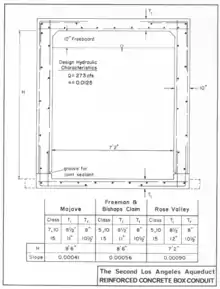 In 1956, the State Department of Water Resources reported that Los Angeles was only exporting 320,000 acre-feet (390 million cubic metres) of water of the 590,000 acre⋅ft (730 million m3) available in the Owens Valley and Mono Basin. Three years later, the State Water Rights Board warned Los Angeles that they could lose rights to the water they were permitted for but not appropriating. Faced with the possible loss of future water supply, Los Angeles began the five-year construction of the aqueduct in 1965 at a cost US$89 million.[5] Once the city received diversion permits, water exports jumped in 1970, adding 110,000 AF that year into the aqueduct system. By 1974, exports climbed to 450,000 acre⋅ft (560 million m3) per year.[29] Unlike the First Aqueduct which was built entirely by Public Works, the Second Los Angeles Aqueduct was primarily built on contract by various private construction firms including R.A. Wattson Co., Winston Bros., and the Griffith Co. The Los Angeles Department of Water and Power managed the project and performed some finishing construction on the Mojave conduit and Jawbone & Dove Spring pipelines.