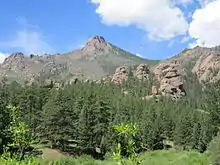 The Lost Creek Scenic Area is a 16,798-acre (67.98 km2)[6][nb 1] site in the Lost Creek Wilderness created in 1963, under the 1939 "U-Regulations", which was the precursor of the Wilderness Act. It was designated a National Natural Landmark in 1966.[7] It is located in the Pike National Forest and is in both Park and Jefferson counties. Rock formations with pinnacles and spires are located in narrow gorges and on ridges. An underground stream "disappears and reappears" nine times or more at the site.[6]