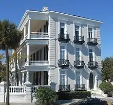 The Louis DeSaussure House is an antebellum house at 1 East Battery, Charleston, South Carolina. The house was designed and built for Louis DeSaussure by William Jones and completed in late 1859.[1] The three-story, masonry house follows a traditional side hall plan; two adjacent parlors are fronted with piazzas along the south side while a stair hall runs along the north side with a front door facing east onto East Battery. In 1865 during the Civil War, the house was damaged when evacuating Confederate forces blew up a large cannon at the corner of East Battery and South Battery; a piece of the cannon was lodged in the attic of the house.[2] The balconies on the East Battery façade and window ornaments were installed when the house was restored after the earthquake of 1886 by Bernard O'Neill, who bought it in 1888.[3] The house was used by the military to house Navy officers during World War II and was later converted into apartments.[4] The carriage house for 1 East Battery was later subdivided into a separate house known as 2 South Battery.[5]