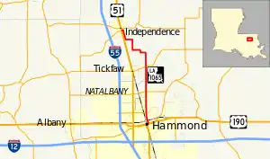 Louisiana Highway 1065 (LA 1065) is a mostly rural highway in Tangipahoa Parish, Louisiana between Hammond and Independence. In its more trafficked southern end it is known as North Cherry Street and outside Hammond, North Cherry Street Extension. LA 1065 is a two-lane highway for the entirety of its 11.1-mile-length (17.9 km).