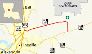The route connects the city of Pineville, as well as the rural area in the northeast corner of the parish, with Esler Regional Airport. Pineville is located opposite the Red River from Alexandria, central Louisiana's largest city. Formerly the area's main airport, Esler is now primarily used as a training ground by the Louisiana National Guard.