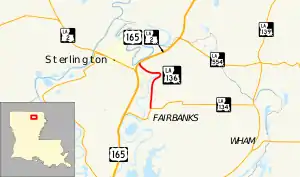 From the south, LA 136 begins at an intersection with LA 134 in the small community of Fairbanks. At this intersection, LA 134 turns east away from Fairbanks while LA 136 proceeds straight ahead in a northerly direction and crosses the Arkansas, Louisiana and Mississippi Railroad (ALM) line at a point known as Fowler. LA 134 parallels Bayou De Siard along a sharp bend to the west at Guthrie. It reaches its eastern terminus soon afterward at an intersection with US 165 and LA 2 at the eastern edge of Sterlington. From this intersection, US 165 and LA 2 travel northeast in a concurrency to Bastrop. Just southwest of the intersection, the two highways split and head toward Monroe and Sterlington, respectively.[2][3][4]