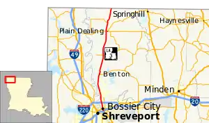 In the summer of 1966, I-20 was opened in Bossier City from the Red River Bridge at Traffic Street to Barksdale Boulevard (US 71).[9][10] As part of this construction, the southernmost portion of LA 3 was shifted onto a new connector, 0.3 miles (0.48 km) in length, known as Benton Spur in order to be aligned with a partial interchange with I-20 at LA 72 (Old Minden Road). The former route along Benton Road then became LA 3 Spur until its deletion from the state highway system in 2010.[3]
