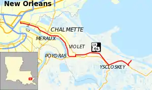 | Shell Beach | 29.5 | 47.5 | Dead end at Mississippi River-Gulf Outlet Canal | Eastern terminus | |