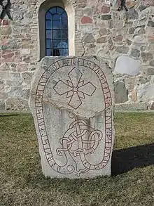 Five runestones known as the Lovö Runestones are currently located around the church. The stones date from the early 11th century, and contain some names of the local people, such as Torgils, Signiut, Holmer, Vig, Tingfast, and Johan.