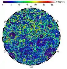 The lunar south pole is the southernmost point on the Moon, at 90°S. It is of special interest to scientists because of the occurrence of water ice in permanently shadowed areas around it. The lunar south pole region features craters that are unique in that the near-constant sunlight does not reach their interior. Such craters are cold traps that contain a fossil record of hydrogen, water ice, and other volatiles dating from the early Solar System.[1][2] In contrast, the lunar north pole region exhibits a much lower quantity of similarly sheltered craters.[3]