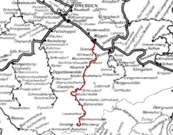 The Heidenau–Kurort Altenberg railway, also known in German as the Müglitztalbahn ("Müglitz Valley Railway") is a German railway in Saxony. Branching off the Elbe Valley Railway, it connects the town of Heidenau near Dresden with the towns of Glashütte and Altenberg in Erzgebirge (Ore Mountains), where it terminates. The total length is 38 km, with a total incline of 634 meters.[2] The scenic track follows primarily the Müglitz river, passing the towns of Dohna, Glashütte and Geising.