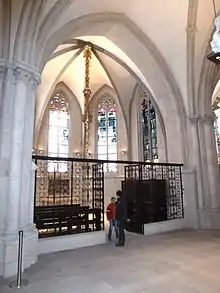 From 2009 til the beginning of 2013, the cathedral underwent renovations – first the facade of the west choir, the west towers, the Salvator pediment and the roof supports. The entire 5500 m2 copper roof was refitted. From the end of 2011 interior work took place: upgrading the heating, ventilation, lighting, audio, and fire safety systems as well as repainting the interior.[7] Fifteen agencies, 51 workshops and 350 individual workers took part in the phase of the renovations lasting from 7 June 2010 to 15 February 2013. During this period, 10,000 square metres of wall and vault surface were repainted, and 24 kilometres of cable were laid. Roofs, walls and artworks in the cathedral were cleaned and repainted. As part of the technological upgrades, an energy-saving heating system, modern LED lighting and a new microphone system were installed. The digital loudspeaker system was also redesigned and a loop installed for the hearing impaired. Disabled access was added at the portal to the astronomical clock. The wooden casing of the clock was replaced. Control of lights, audio and bells was centralised to a control centre in the sacristry. Bright light was ensured by light-wreaths and "light spouts" ("small brass arms extending from the walls, which look like waterspouts and throw their LED light onto the worshippers below and over the walls and ceiling above, so that the cathedral and its vaults are indirectly lit up by its rays.")[8] The total cost of all these measures is believed to be around 14 million euros.[9] During the renovation the grave chamber of the bishops under the west choir was entirely rebuilt; the access is located in the southern tower chapel (C). The building work made it possible for archaeological work to be carried out under the west choir and sacristry.[10] The cathedral was reopened on 15 February 2013.[11]