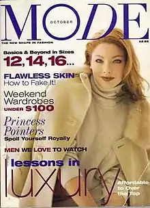 MODE (stylized MODE) was a fashion magazine aimed towards plus-size women which launched in the spring of 1997.[5] The magazine was praised for targeting the plus-size consumer with a Vogue-like fashion philosophy.[5] MODE also helped to increase the growth of the plus-size industry and the caliber of plus-size clothing and advertising.[1] In 1997, MODE was named the best new magazine launch by Ad Week and Advertising Age.[5] MODE also ran model search competitions in conjunction with the Wilhelmina modeling agency, drawing entries from thousands of hopefuls from the US and Canada.[6][7][8] Its circulation was approximately 600,000 at the time of its demise[4] in October 2001.[9]
