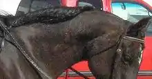 On horses, the mane is the hair that grows from the top of the neck of a horse or other equine, reaching from the poll to the withers, and includes the forelock or foretop.[1] It is thicker and coarser than the rest of the horse's coat, and naturally grows to roughly cover the neck. Heredity plays a role, giving some horses a longer, thicker mane, and others a shorter, thinner one.