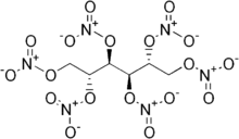 Mannitol hexanitrate is a secondary explosive formed by the nitration of mannitol, a sugar alcohol. The product is used in medicine as a vasodilator and as an explosive in blasting caps. Its sensitivity is high, particularly at high temperatures (> 75 °C) where it is slightly more sensitive than nitroglycerine. Nitromannite is a class B explosive.
