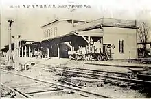 The Boston and Providence Railroad opened through Mansfield in 1835, with a flat-roofed depot built near the modern station site. The Taunton Branch Railroad opened the next year; through cars operated to New Bedford soon after the New Bedford and Taunton Railroad opened in 1840, though the service was not suitable for commuters until 1885.[2] The Mansfield and Framingham Railroad opened in 1870 as part of the Boston, Clinton and Fitchburg Railroad; it was merged into the Boston, Clinton, Fitchburg and New Bedford Railroad in 1876 which itself became part of the Old Colony Railroad system in 1883 as the Old Colony's entrance to northern Massachusetts.[3]
