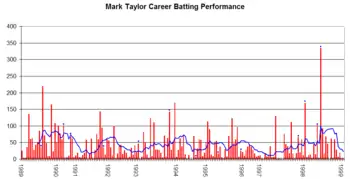 Against the West Indies in 1992–93, Taylor was now opening alongside David Boon[19] with Moody having been dropped.[20] Taylor was ineffective and failed to pass fifty in the first four Tests.[10] After Australia failed by one run to win the Fourth Test and thus the series,[14] Taylor was dropped for the deciding Test at Perth,[21] having failed to make double figures in either innings.[10] In his absence, Australia lost by an innings in three days and conceded the series 1–2.[6][10][14][22] He had scored 170 runs at 24.29 for the series.[10] However, he played all of Australia's ten ODIs, scoring 286 runs at 28.60 with two half-centuries.[11][12]
