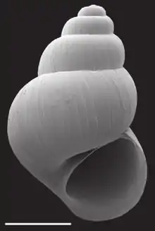 The shell is ovate-conic with 4.5–5.5 whorls.[2] The height of the shell is about 2.6–4.6 mm.[2] Protoconch is near planispiral, slightly tilted, initial 0.75–1.0 whorl strongly wrinkled.[2] Teleoconch whorls are weakly convex, often narrowly shouldered, rarely having subsutural angulation.[2] The sculpture of strong collabral growth lines, later whorls having numerous weak spiral striae.[2] The aperture is pyriform or ovate.[2] Inner lip complete across parietal wall in larger specimens, usually narrowly adnate, rarely slightly disjunct; usually thin, sometimes slightly thickened apically; columellar shelf absent or very narrow; outer lip thin or slightly thickened, orthocline or prosocline.[2] Umbilicus is open but small.[2]