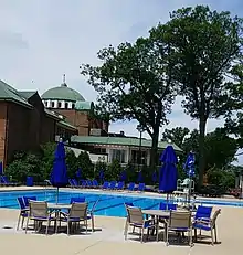 Located to the southeast side of the clubhouse, the pool features two diving boards, five competitive swim lanes, as well as a deck for seating. Near the poolside is the Cabana bar and a snack bar.