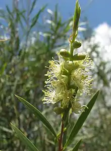 The flowers red, pink, cream or white. They are arranged in spikes on the ends of branches that continue to grow after flowering and also on the sides of the branches. The spikes are up to 27 mm (1 in) in diameter with 7 to 17 individual flowers. The petals are 2.5–4.4 mm (0.1–0.2 in) long and fall off as the flower ages. There are 52 to 71 stamens in each flower, some of which are joined in bundles. Flowering occurs at unpredictable times throughout the year and is followed by fruit that are woody capsules, 2.8–4.5 mm (0.1–0.2 in) long.[3]