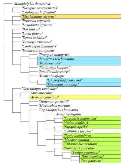 Most female mammals have an estrous cycle, yet only ten primate species, four bat species, the elephant shrew, and one known species of spiny mouse have a menstrual cycle.[19][20] As these groups are not closely related, it is likely that four distinct evolutionary events have caused menstruation to arise.[21]