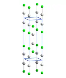 In common with other Hg(I) (mercurous) compounds which contain linear X-Hg-Hg-X units, Hg2F2 contains linear FHg2F units with an Hg-Hg bond length of 251 pm (Hg-Hg in the metal is 300 pm) and an Hg-F bond length of 214 pm.[5] The overall coordination of each Hg atom is a distorted octahedron; in addition to the bonded F and other Hg of the molecule, there are four other F atoms at 272 pm.[5] The compound is often formulated as Hg22+ 2F−.[6]