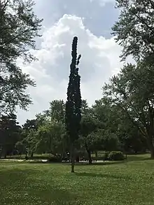The park includes the Hollis and Helen Baright Playground. A long sloping green is popular with kids, dogs and adults for soccer, lacrosse, catch and playing fetch, with “the pencil tree” often playing the role of home base. Other features include a Little Free Library, a bike repair stand with tools and tire pump, three pet waste bag stations, a rain garden and a sundial.[7]