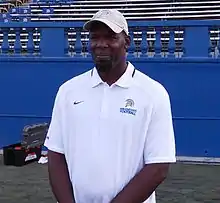 Mike Stock's tenure as head coach is primarily remembered for a school-record 27-game losing streak from 1980 through 1982, including a winless season in 1981.[36] He was fired after the team lost the first three games of 1982, including a 49–12 pasting at Louisiana Tech and 35–0 shutout at Miami University, bringing the losing streak to 22 games; the team went on to lose five more consecutive games under interim coach Bob LaPointe before the streak was broken with a 9–7 win over Kent State on November 6, 1982.[37] Stock's teams were held scoreless seven times, his teams were outscored by a total of 809 points — nearly 18 points per game, and his final record of 6–38–1 gives him a 14.4% win percentage, easily the lowest of any coach to remain at Eastern more than one season.[5] Stock continued to coach football both at the collegiate level and the professional level, both in the United States Football League and the National Football League, until his retirement following the 2008 NFL season, but this was his only head coaching position.[38][39]