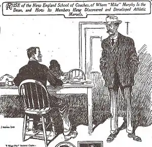 Murphy was reportedly beloved by the athletes he trained and instilled tremendous loyalty in them. It was reported during Murphy's lifetime that there was "not a man who ever trained under Mike Murphy who wouldn't go to the end of the world for the veteran trainer if he desired it."[19] He reportedly had "some peculiar means of persuasion and development that makes men win."[20] Murphy's "first object was always to get the confidence of a student, which soon developed into a love for the man and his work."[5] The chair of Penn's physical education department once described Murphy's motivational approach as follows: