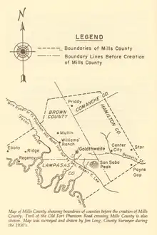 By 1885, the pre-Mills area had reached a population of 6,493 and had become civilized enough to justify forming a new county.[1][12] At the time, the only significant communities were Center City, Mullin, Star, and Williams Ranch.[1] Even so, both Goldthwaite and Mullin were only tent villages.[1][12]