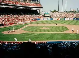 By the 1990s, County Stadium was considered outdated, lacking the amenities (most notably luxury boxes) that generated additional revenue for teams. On July 11, 1992, Selig announced plans for a publicly financed replacement to be built adjacent to County Stadium, opening in time for the 1994 season.[39] In the meantime, a demonstration luxury box was built in the stadium in order to demonstrate the viability of one to local politicians and the city's larger corporations.[40] In addition, the stadium was the only one in MLB that lacked some sort of color videoboard (it used a monochrome Omega scoreboard built in 1980).[41]