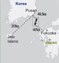 Tsushima (対馬市, Tsushima-shi) is an island city grouped in Nagasaki Prefecture, Japan. It is the only city of Tsushima Subprefecture and it encompasses all of Tsushima Island, which lies in the Tsushima Strait north of Nagasaki on the western side of Kyushu, the southernmost mainland island of Japan. As of March 2017, the city has an estimated population of 31,550[1] and a population density of 45 persons per km2. Its total area is 708.61 km2, 17.3% of the area of Nagasaki Prefecture.