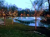 It was a tradition for students to jump into the lake at night in the week leading up to the annual football game between the Ohio State Buckeyes and the Michigan Wolverines. Although students have jumped into Mirror Lake since 1969, the modern tradition started in 1990 when Jim Jones led a parade of students on a traditional march around campus. At the end of the parade — at Mirror Lake — students made the celebratory jump.[6] Approximately 12,000 people either jumped or were near the lake for the 2009 jump.[7] Jumps have occurred several times outside of Michigan Week, including on the night of May 1, 2011 when students jumped into the lake in the wake of the death of Osama bin Laden.[8] The Mirror Lake Jump events were not university sponsored, and people were encouraged by university officials to not participate in the events.[9] The tradition ended in the mid-2010s after a student death occurred, and the university began enforcing policies to prevent jumps from occurring.[10] Jumping into Mirror Lake is a fourth-degree misdemeanor, however police acknowledged that they ignored this during jump events in order to focus on the safety of those present.[11]