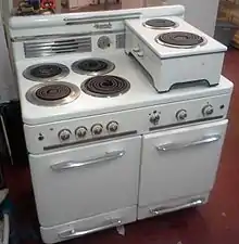 During World War II, the Malleable Iron Range Company produced 75mm artillery shells, truck bodies, and gas and water cans. Although US home appliance manufacturing was shut down early in the war, in 1943 the Defense department ordered 1,000, 20-inch, apartment sized electric ranges. These were shipped to Oak Ridge, Tennessee for use by workers in the Manhattan Project. On April 17, 1943 U.S. Undersecretary of War announced the Malleable Iron Range Co. had won the Army-Navy "E" Award. By war's end four white stars for quality and quantity produced had been added to the award pennant.[1] In February, 1945 the War Production Board authorized the company to produce 3,750 electric ranges.[15]