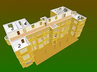 Key: 1: Long Gallery, 2: Blew Chamber in 1635, now an exhibition room, 3: Wainscott Chamber in 1635, now an exhibition room, 4: Former bedroom, not open to the public, 5: Primrose Chamber in 1635, now an exhibition room, 6: White Chamber in 1635, now an exhibition room.