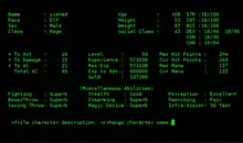The player has many characteristics in the game. Some characteristics, like sex, weight, and height, cannot be changed once the player has been created, while other characteristics like strength, intelligence, and armor class can be modified by using certain items in a particular way. Mana and hit points are replenished by rest or by some other magical means. Gold accrues as the player steps on gems or currency. Experience accrues as the player performs various actions in the dungeon, mostly by killing creatures. The "miscellaneous abilities" are modified as each skill is performed and as the player increases in experience.