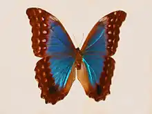 The genus Morpho is palatable but some species (such as M. amathonte) are very strong fliers; birds – even species which are specialized for catching butterflies on the wing – find it very hard to catch them.[1][2] The conspicuous blue coloration shared by most Morpho species may be a case of Müllerian mimicry, or may be 'pursuit aposematism'.[3]