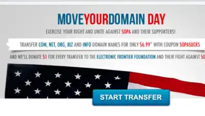 Move Your Domain Day is an annual observance encouraging owners of domain names to transfer their domain registration away from registrars that supported the Stop Online Piracy Act (SOPA). It was first held on 29 December 2011, the idea coming from a post on Reddit as a protest against prominent registrar GoDaddy's support for SOPA.[1] In 2012, rival registrar Namecheap began an initiative to make Move Your Domain Day an annual event.[2] Subsequent events were held on 22 January 2013, 5 February 2014, and 27 January 2015. The Electronic Frontier Foundation, Reddit, and domain registrars Name.com and Hover have also participated.[3] Namecheap has defined the initiative as "an annual protest and a commemoration of sorts that will continue to shine a light on the issue of a free and open internet."[4]