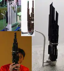 Xiao or Dongxiao is a traditional Chinese vertical end blown flute widely used in Chinese folk music for its “mellow and melancholic” tone.[14] The oldest known Xiao, carved from bone is dated circa 6000BC, however the instrument's origin is more commonly attributed to the bamboo flutes of the Han dynasty.[14] The construction of a modern Xiao consists of 7 finger holes and one thumb hole on the back. Between 70 and 80 cm in length the Xiao has a range of two octaves similar to the Di.[14]