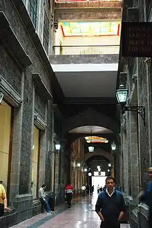 Operations began in 1775 in the College of Saints Peter and Paul and where the current main office is now.[6] In 1818, Don Viceroy Apodaca ordered the evacuation of the building due to problems with the Independence movement but this did not happen until 1821, when King Ferdinand VII confiscated Jesuit properties.[1] The foundation moved to the Franciscan Convent of Saint Bridget that was on Juárez Avenue and San Juan de Letrán Street (now Eje Central).[1][6] It moved again in 1836 to two houses on Empedradillo Street off a difference section of the Zocalo that were owned by the Duke of Monteleone,[6] a descendant of Hernan Cortés.[4] Some time after the College of Saints Peter and Paul moved to what is now the Colegio de San Ildefonso, the Monte de Piedad bought the old college structure and its original home from the Duke of Monteleone in 1836.[3][4][6]