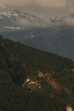 One of Shakya Rinchen Rinpoche's main disciples built the original lower temple (Sonam Ghatsel temple) but it was destroyed by fire. It was rebuilt in the 1960s, during the Fourth King's (Jigme Singye Wangchuck) reign, with the support of the Queen Great Grandmother Ashi Kesang Choden Wangchuk.