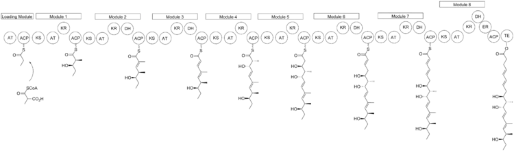 The polyketide chain produced then undergoes a ring closure to form the large lactone ring and a Diels–Alder reaction to form the fused cyclohexane/cyclohexene rings. The oxygen atoms attached to carbons in positions that do not correspond to polyketides—carbons 8 and 13 (the ether bridge), carbon 2 (the methoxy substituent), and carbon 18 (on the hydroxyethyl chain attached to the lactone ring) are derived from molecular oxygen.[7]