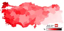 The constitutional referendum ultimately passed with a narrow margin of 2-3% on an 85% voter turnout.[15] Meanwhile, the main opposition Republican People's Party (CHP), along with MHP now-dissidents such as Meral Akşener who would go onto establish the Good Party (İYİ),[16] voiced strong opposition to the constitutional amendments which were deemed undemocratic, autocratic and seen as a threat to rule of law, democracy and separation of powers within the country.[17]