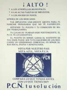 The party was de facto re-established, registering with the Supreme Electoral Tribunal as the National Coalition ('Concertación Nacional', CN) in September 2011.[5] After one year, it added the word 'Partido' ("party") to its full name, which allowed it to again use the traditional acronym PCN.[6] Since 2018, the party has 9 out of 84 congressmen and 25 out of 262 mayorship offices.