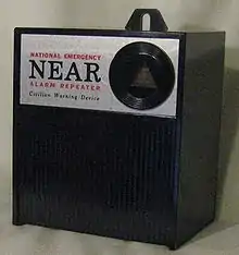 The National Emergency Alarm Repeater (NEAR) was a civilian emergency warning device in the United States. It was a 2–3" (5–7.5 cm) square box designed to plug into a standard power outlet to receive a special signal sent over the electric power transmission lines. Research and testing for the NEAR program was developed in 1956 during the Cold War to supplement the existing siren warning systems and radio broadcasts in the event of a nuclear attack. The advent of the radio Emergency Broadcast System rendered NEAR obsolete, although a severe disadvantage inherent in the Emergency Broadcast System was that it required a television or radio to be turned on for a household to receive the emergency alarm, whereas NEAR did not. Despite this advantage, upon the introduction of the Emergency Broadcast System, stockpiled NEAR repeaters were destroyed by their respective manufacturers.[1]