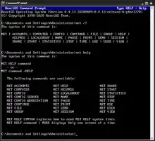 | help | Display syntax | No | IBM OS/2 LAN Server, OS/2 Warp 4.5[7] | Windows 95, Windows 98, Windows NT, Windows 2000, Windows XP, Windows Vista, Windows 7, Windows 8, Windows 10[8][3][9] | ReactOS 0.4.8[20] | |