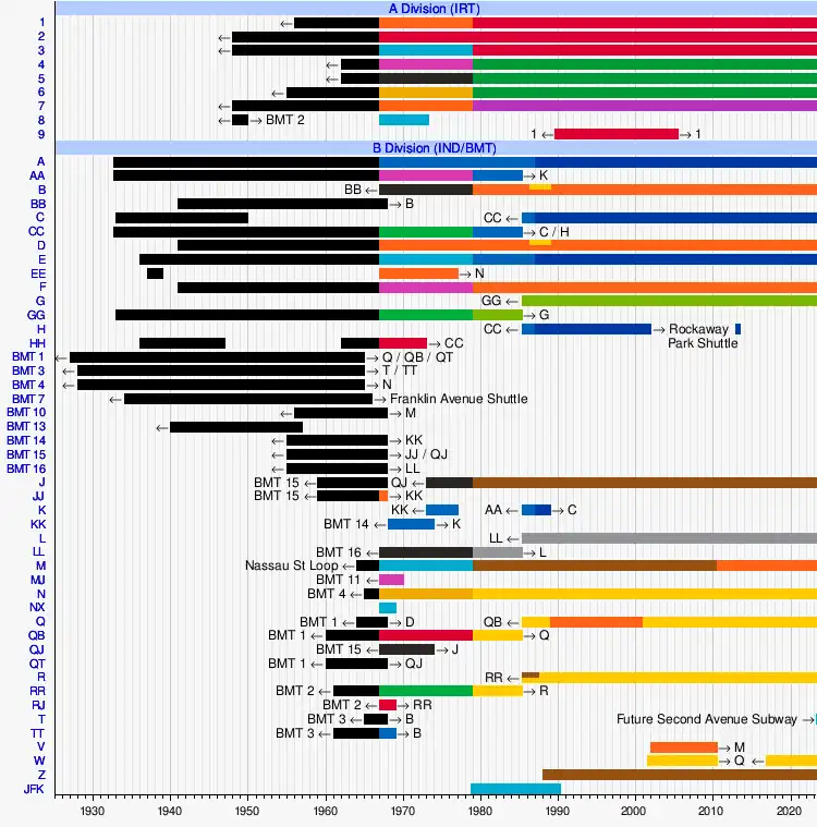 The colors used to denote services in the current iteration of the subway map are as follows: