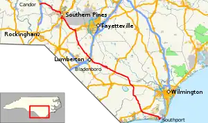 North Carolina Highway 211 (NC 211) is a 162.5-mile-long (261.5 km) primary state highway in the U.S. state of North Carolina. It traverses mostly through the Sandhills and Coastal Plain regions of the state; connecting the cities of Candor, Aberdeen, Raeford, Lumberton, Bladenboro, and Southport.