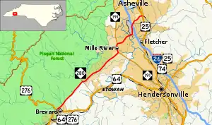 North Carolina Highway 280 (NC 280) is a primary state highway in the U.S. state of North Carolina that runs from the city of Brevard in Transylvania County to the town of Fletcher in Henderson County. It is 18 miles (29 km) in length, starting at the intersection with US 64 and US 276 north of Brevard to US 25 and US 25A in the Asheville community of Arden.