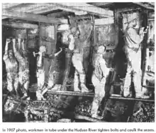 Led by Chief Engineer Charles M. Jacobs, the tunnel design team began work in 1902.[14] The contract for building the North River Tunnels was awarded to O'Rourke Engineering Construction Company in 1904.[15] Originally, the tunnel would have comprised three tubes, but this was later downsized to two tubes.[16] The first construction work comprised the digging of two shafts: one just east of 11th Avenue a few hundred yards east of the river's eastern shore; and a larger one in Weehawken, a few hundred yards west of the river's western shore. Construction on the Weehawken Shaft started in June 1903. It was completed in September 1904 as a concrete-walled rectangular pit, 56 by 116 ft (17.1 by 35.4 m) at the bottom and 76 ft (23.2 m) deep.[13]