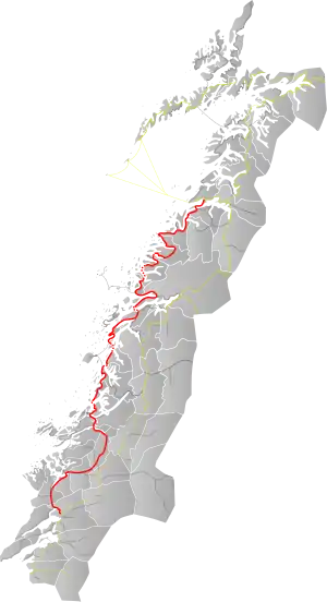County Road 17 (Norwegian: Fylkesvei 17), also known as the Coastal Highway (Norwegian: Kystriksveien), is a Norwegian highway that runs from the town of Bodø in Nordland county (in the north) to the town of Steinkjer in Trøndelag county (in the south). It is 630 kilometres (390 mi) long and includes six ferry crossings. The road runs along the coast of Nordland and Trøndelag counties through 28 different municipalities. This road is a much more scenic, albeit longer and more time-consuming, route than the inland European Route E6 highway.[1]